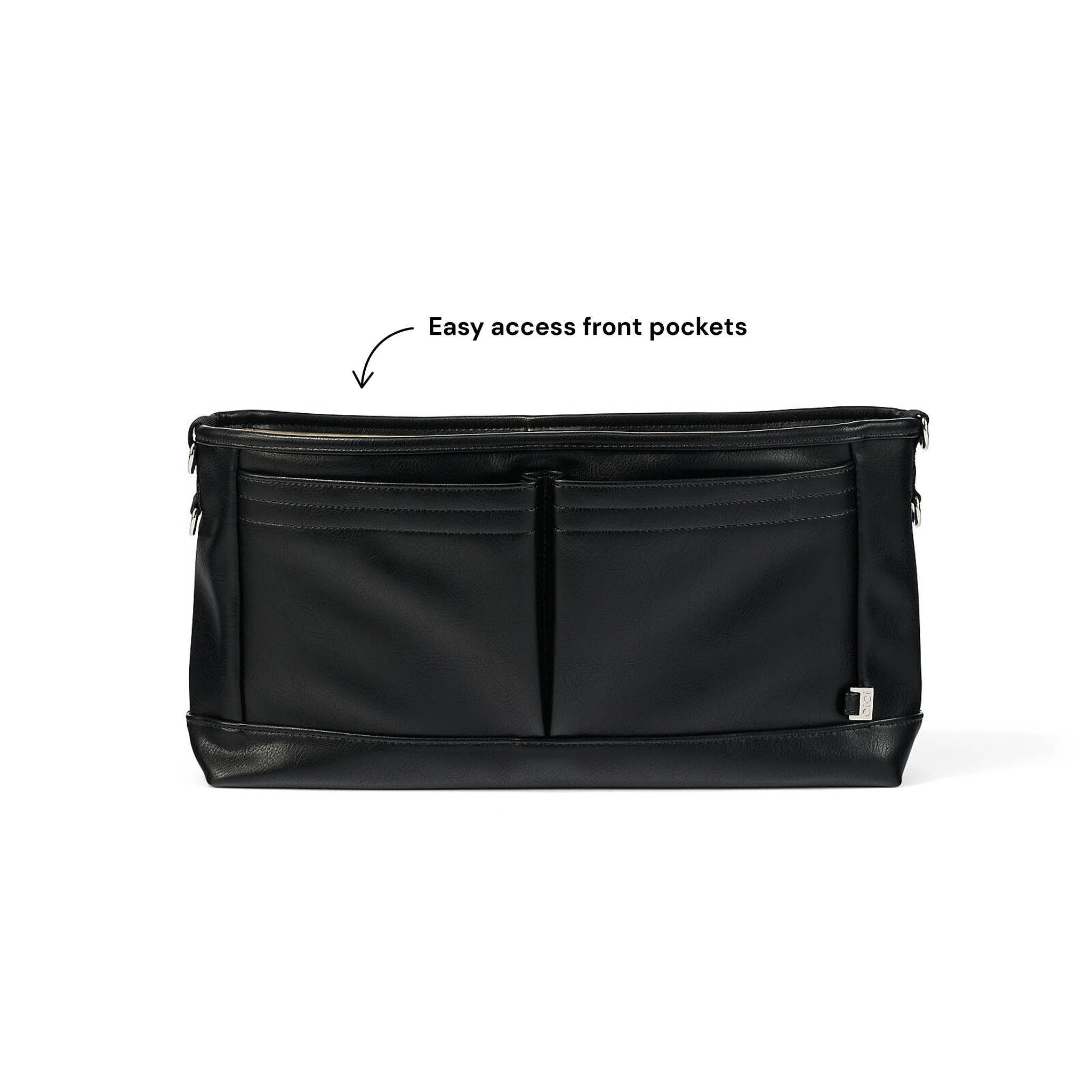 Keep your essentials organised and in easy reach with the OiOi Black Faux Leather Pram Caddy. With adjustable and detachable stroller straps, it securely attaches to any pram with ease and it also converts into a shoulder bag!